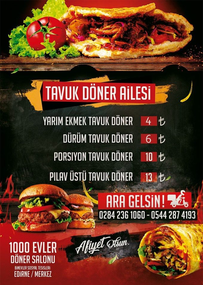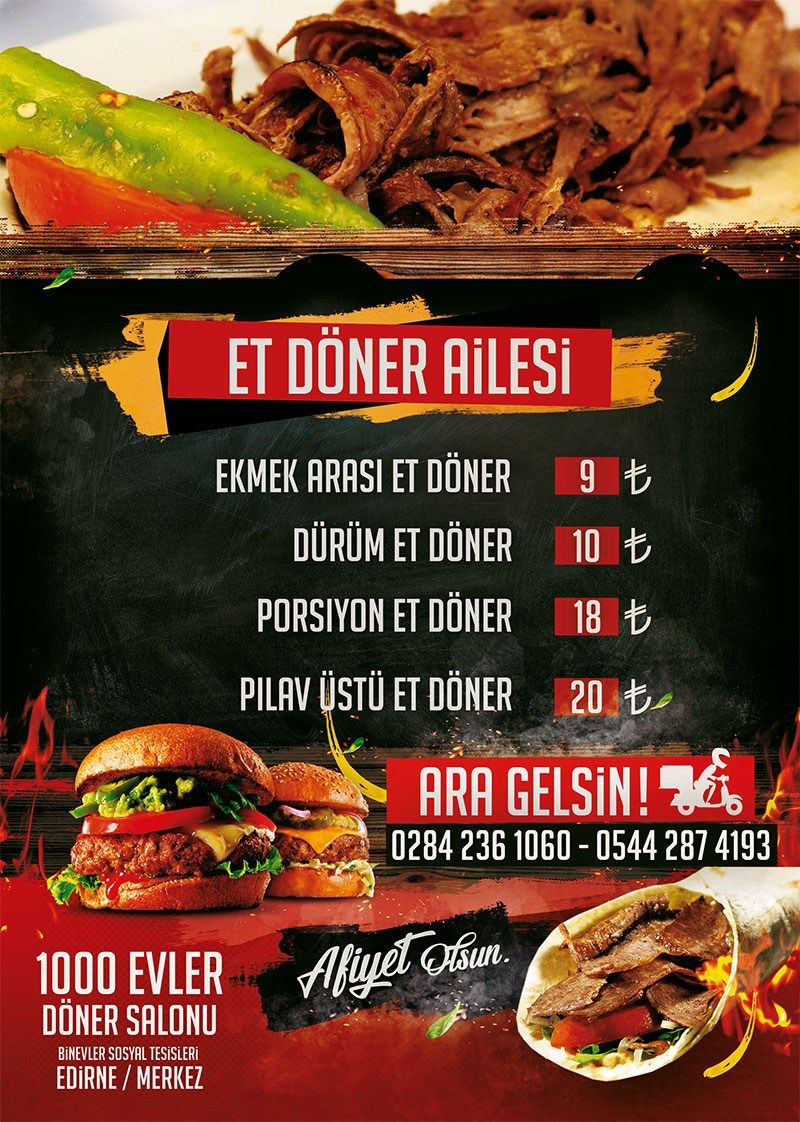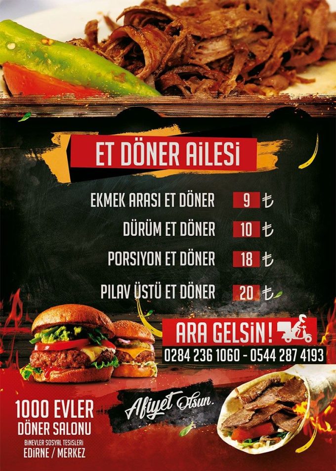 Edirne’de benim bildiğim et kalitesi lezzeti en yüksek dönerci. Ortam salaş öğrenciye yönelik. 1000evler döner Edirne’de kendimi bildim bileli yediğim en iyi döneri yapıyor.